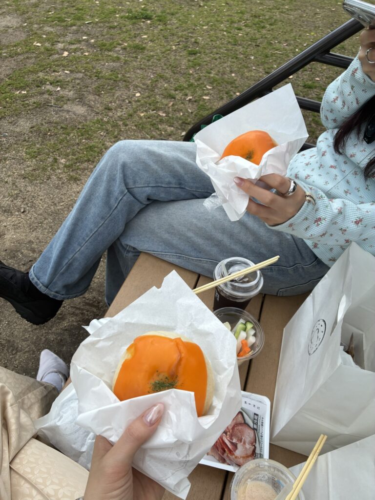 天気が良かったので買ったベーグルを持って公園でピクニックしました^^